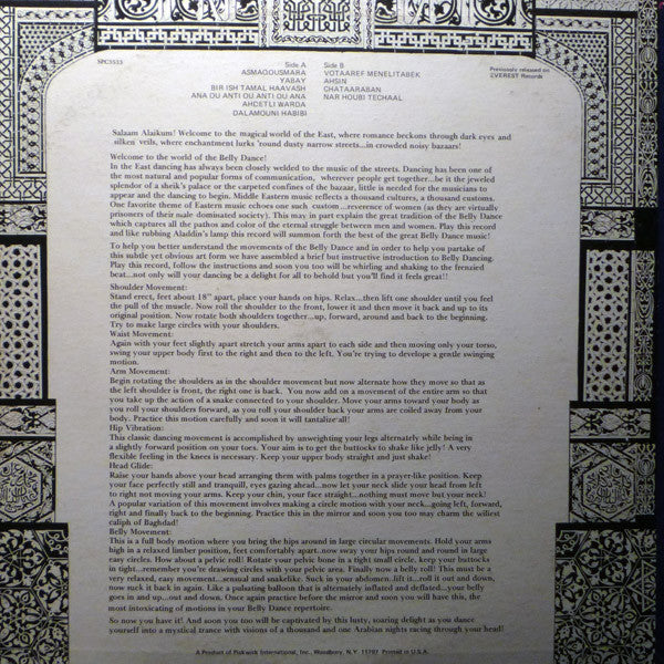 Belly Dance! (The Wild Music & The How-To!), "Asmaqousmara" "Ahdetli Warda", "Votaaref Menelitabek" appear on sleeve, Belly Dance "The Wild Music And The How To", "Asmaqousmaka", "Ah Detli Wakda", "Votaaref Menelihabek" appear on labels. SPC 3533 appears on front of sleeve and labels, SPC3533 appears on back of sleeve.